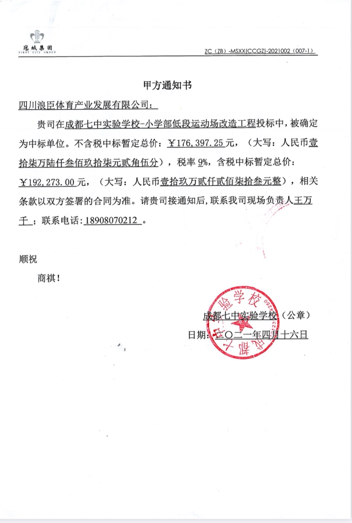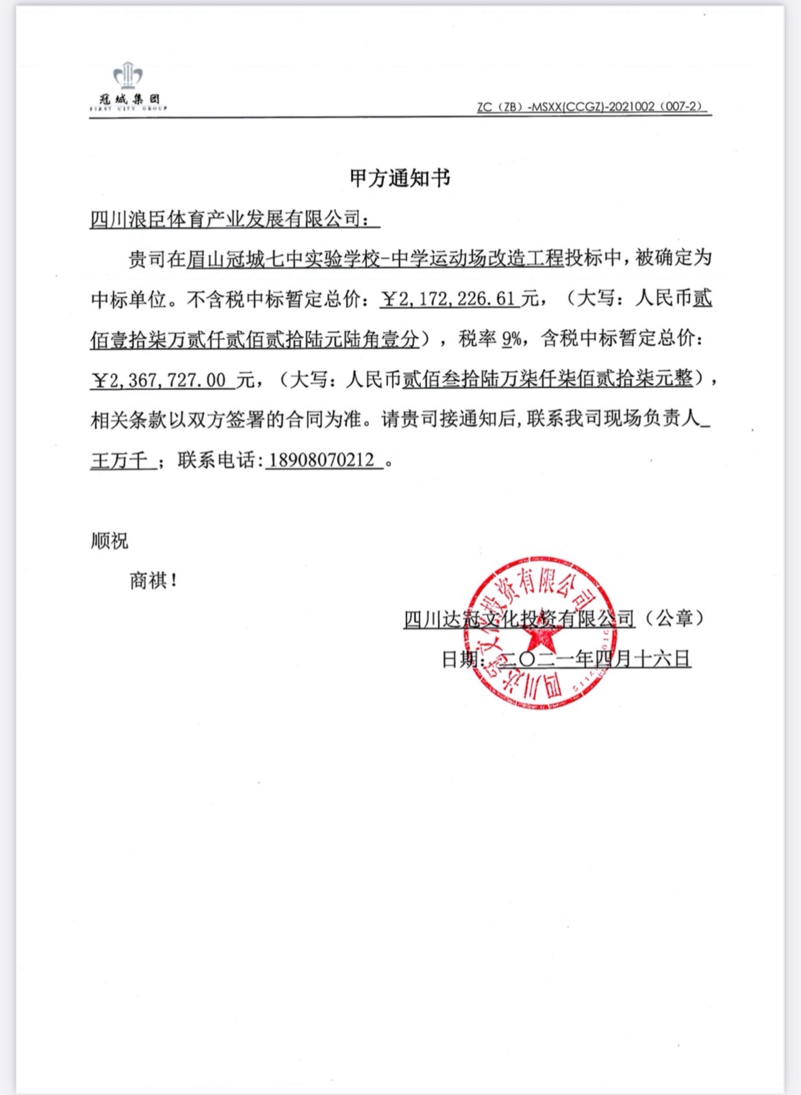 2021年4月16日我司中标“成都七中实验学校-小学部低段运动场改造工程”“眉山冠城七中实验学校-中学运动场改造工程”项目