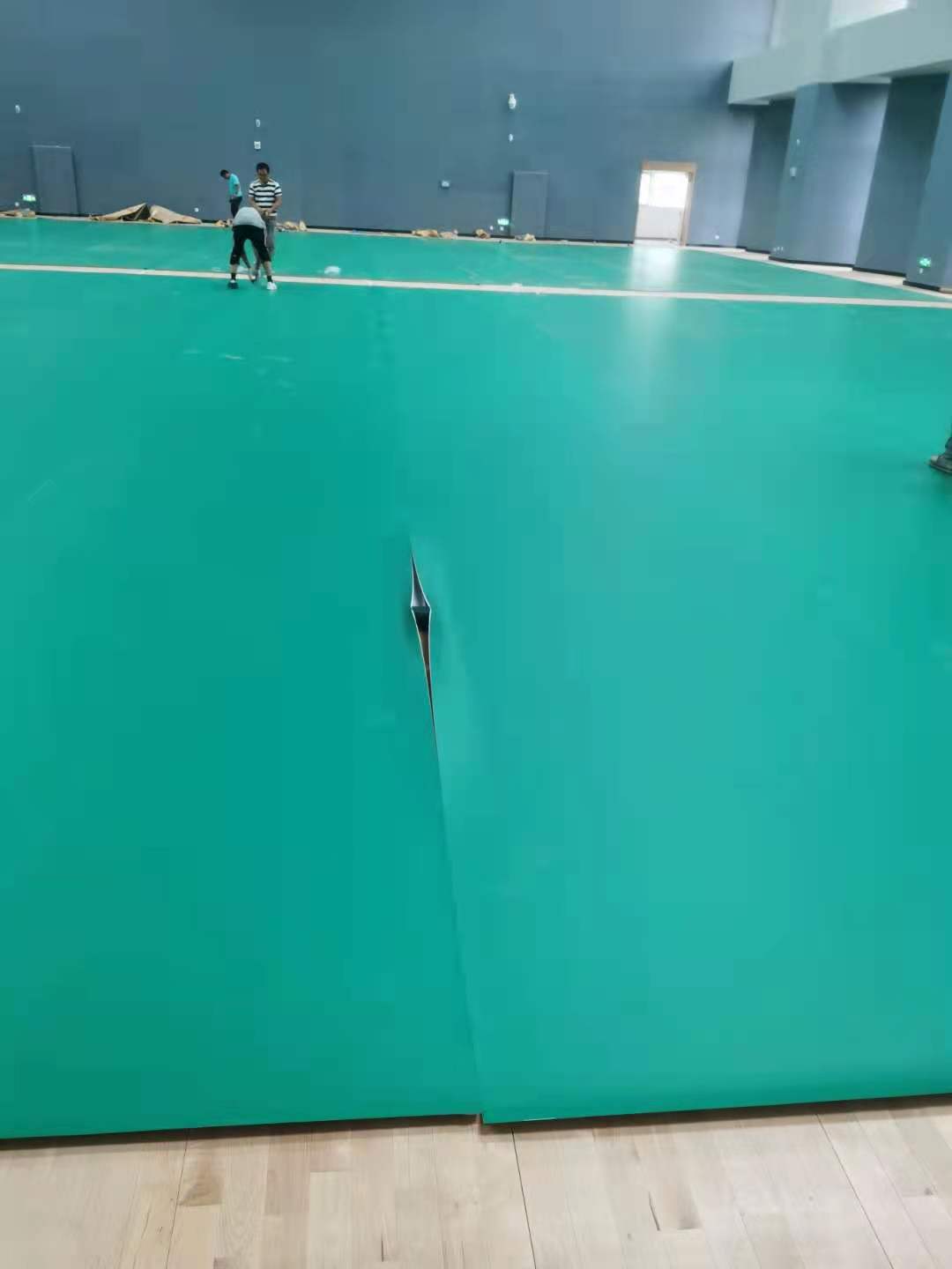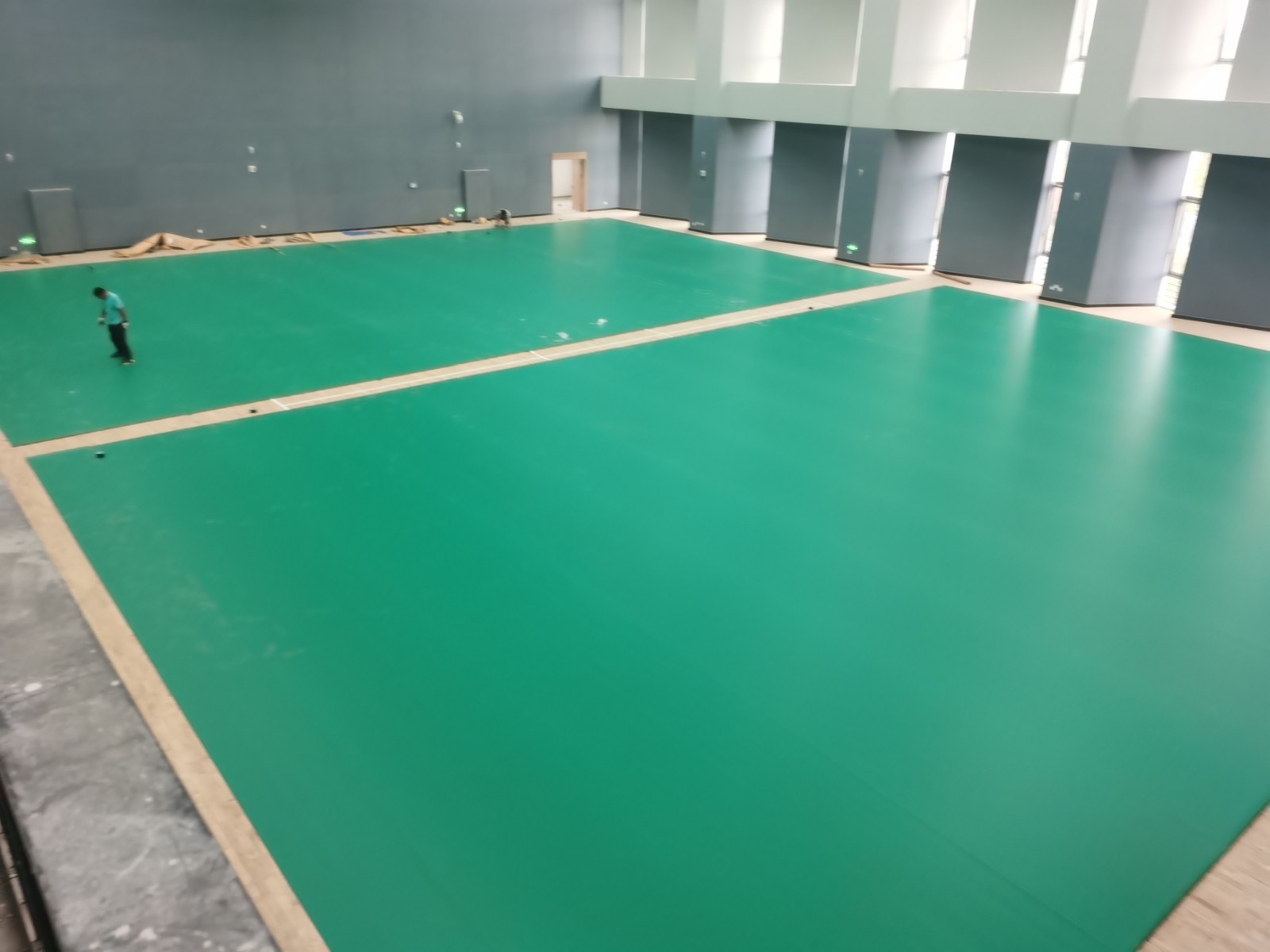2021年5月12日我司承建的中科院成都分院室内PVC羽毛球场铺设中。