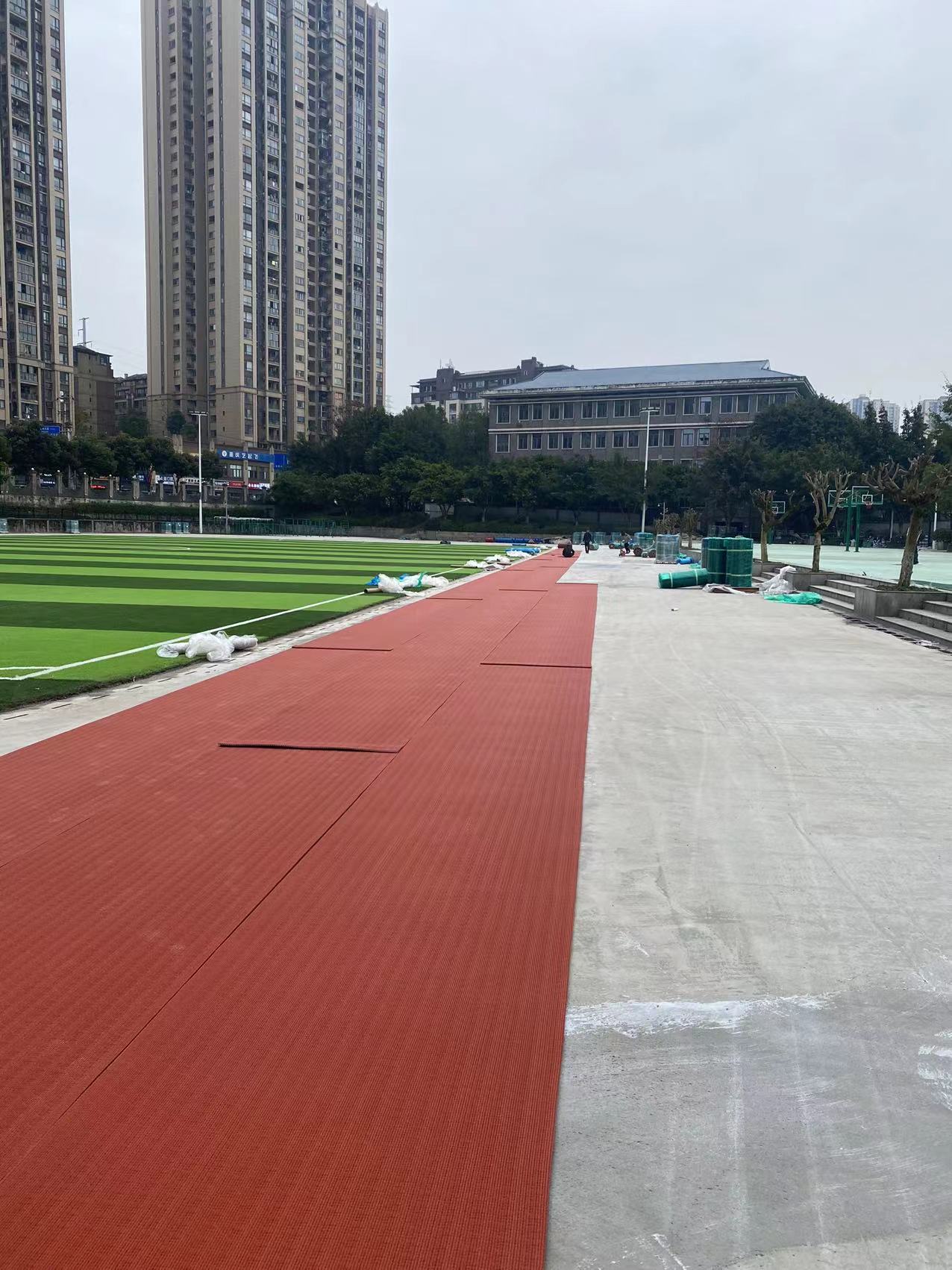 2022年2月10日,重庆市财政学校400米预制型橡胶跑道卷材铺设中