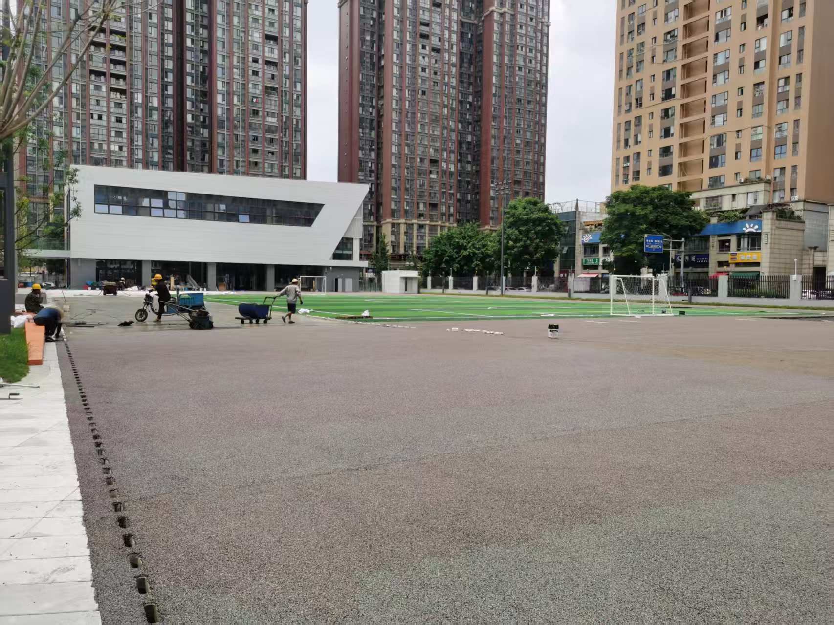2025年6月25日橡树林小学运动场塑胶跑道弹性层施工中,体育器材安装完成
